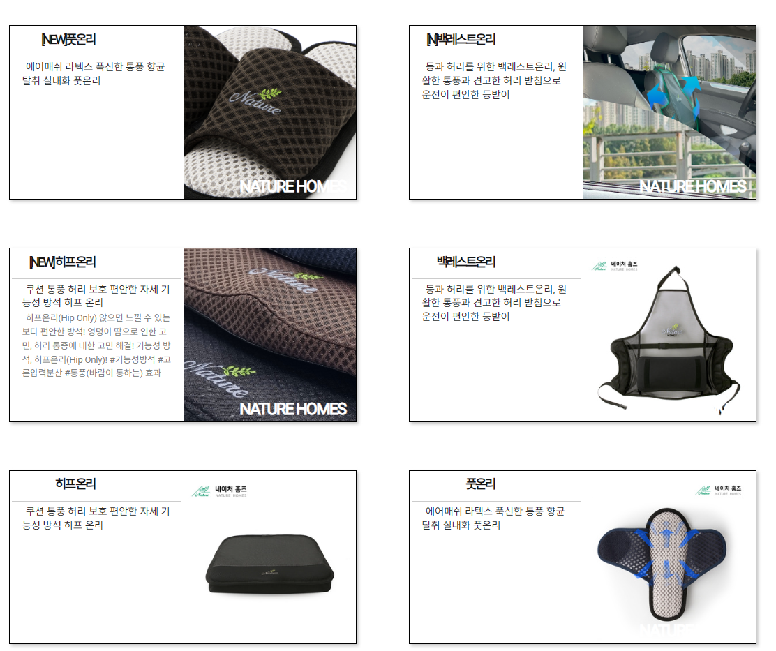 Internet Explorer 버젼과 호환되지 않습니다. Chrome,edge,Firefox 등 다른 브라우져를 사용하세요 자연과 삶을 조화롭게NATURE HOMES 제품소개 백레스트온리 기능성 쿠션 차량용 허리보호 등받이 통풍쿠션