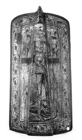 중세 유럽의 전쟁에서 궁병이나 쇠뇌병들이 사용한 대형방패의 일종. 저기 방패 가운데에 있는 툭 튀어나온 부분은 말뚝을 땅에 박고 쉽게 고정시킬 수 있게 만들어진 홈이다.